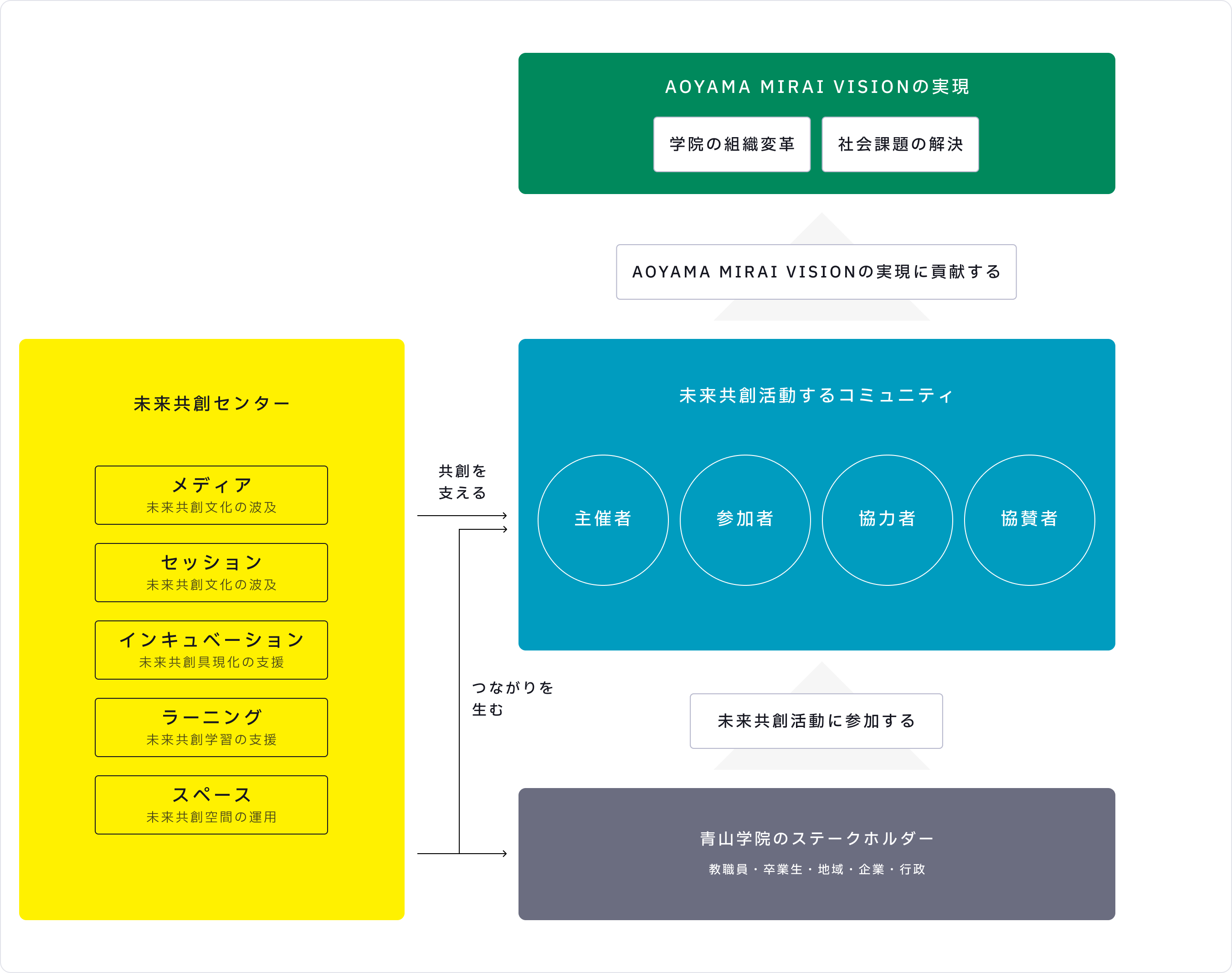 学院内外のステークホルダーと未来共創するコミュニティを形成することで、社会と青山学院との友好的つながりの拡大・持続を促進する