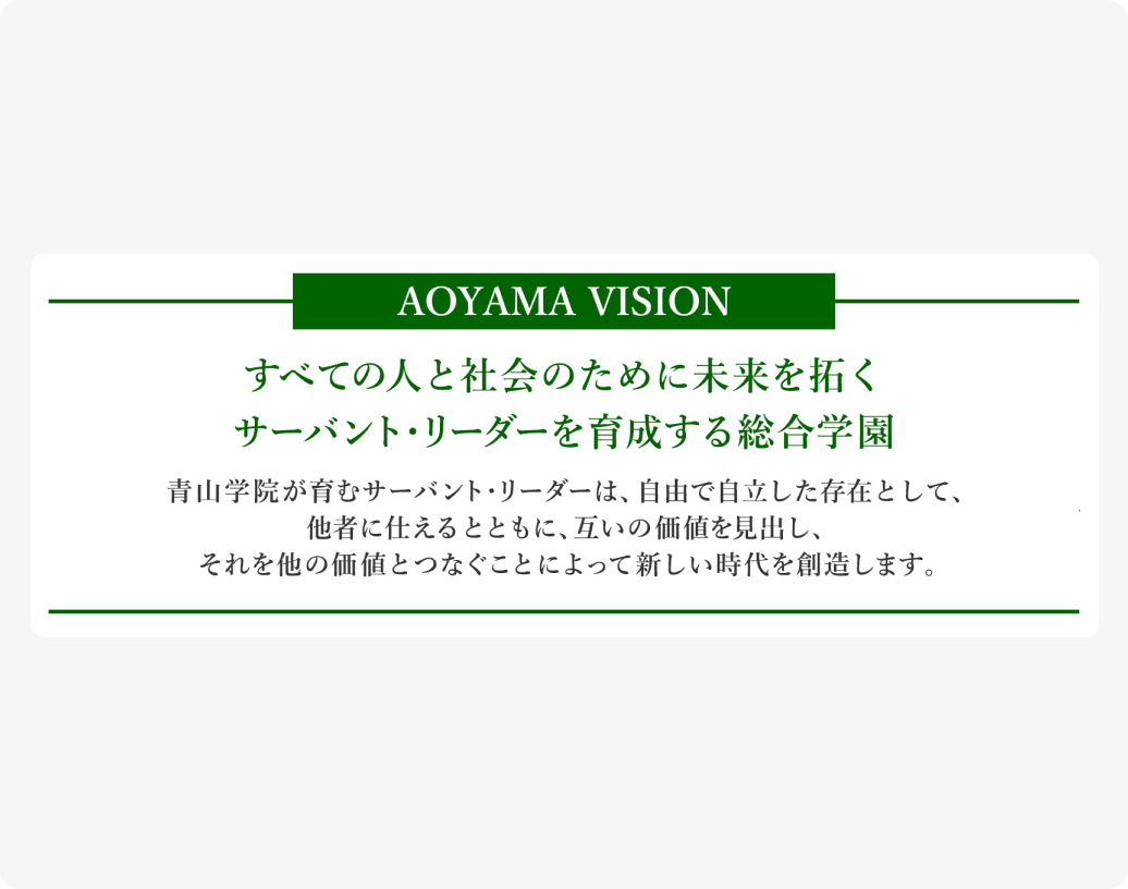 青山学院のミッションをいしずえに、「AOYAMA VISION」に掲げた「サーバント・リーダーの育成」を
